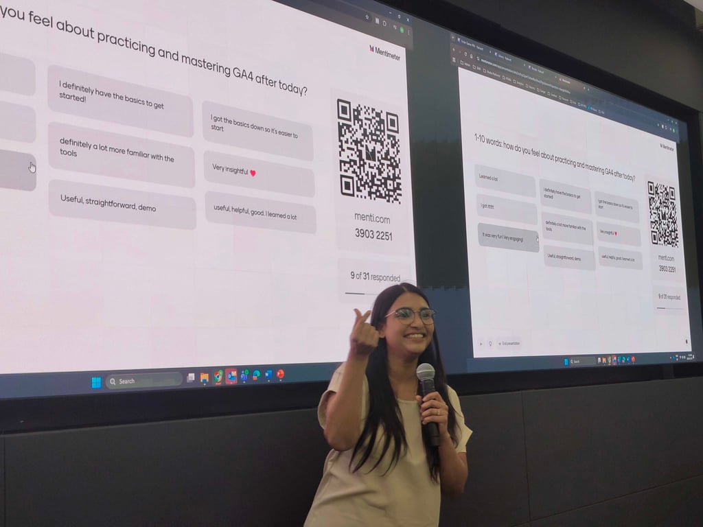 To keep it interactive, we used two word clouds to capture how students felt about GA4 before and after, plus live feedback and a Kahoot.